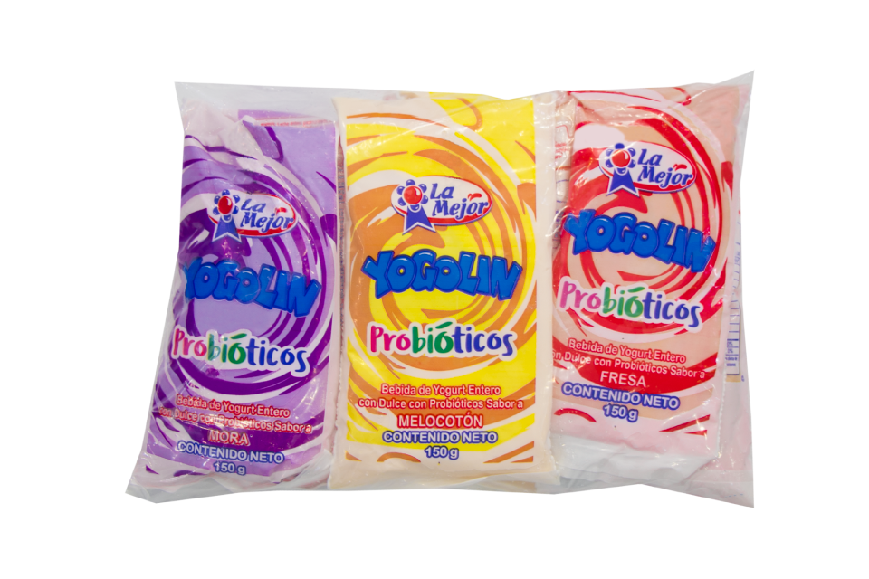 Yogurt con deliciosos sabores a Fresa, Mora y Melocotón.